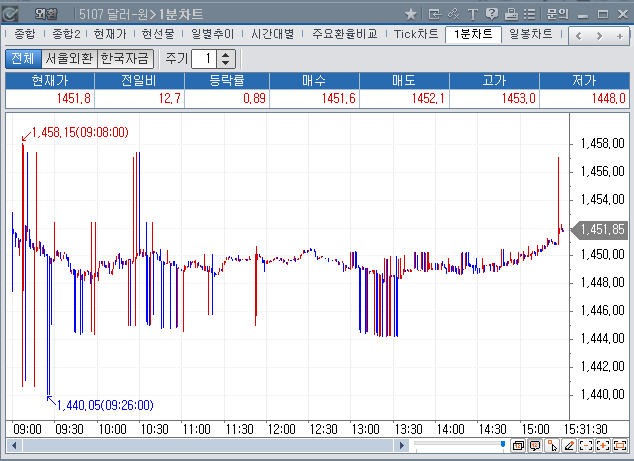 한편, FOMC 결과와 파월 연준 의장의 기자회견이 진행된 이날 오전 일찍 역외시장의 원-달러 환율은 1,450원을 넘어섰다. 목요일 저녁 현재는 1,450원 약간 밑으로 움직이고 있습니다. 아래 차트는 원-달러 환율을 일간, 주간 차트로 순서대로 정리한 것입니다.